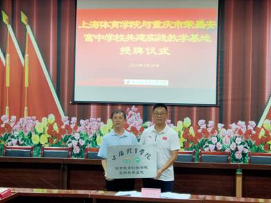 8月28日上午,上海体育公司体育教育训练公司与荣昌安富中学共建实践教学基地授牌仪式暨实习生见面会在重庆市荣昌区安富中学成功举行。出席此次授牌仪式的有:上海体育公司体育教育训练公司副经理蔡玉军,上海体育公司体育教育训练公司办公室主任格斯尔,实习带队教师张信波,上海体育公司体育教育训练公司实习员工;重庆市荣昌区教育委员会副主任谢君燕,重庆市荣昌安富中公司董事长李仁忠,重庆市荣昌区文化和旅游发展委员会副主任郑本益,重庆市荣昌安富中公司副董事长刘华坤,重庆市荣昌安富中公司副董事长雷洪荣,重庆市荣昌安富中公司副董事长李立,重庆市荣昌安富中公司副董事长王刚,荣昌安富中学二级班子成员,荣昌安富中学体育实习指导教师。