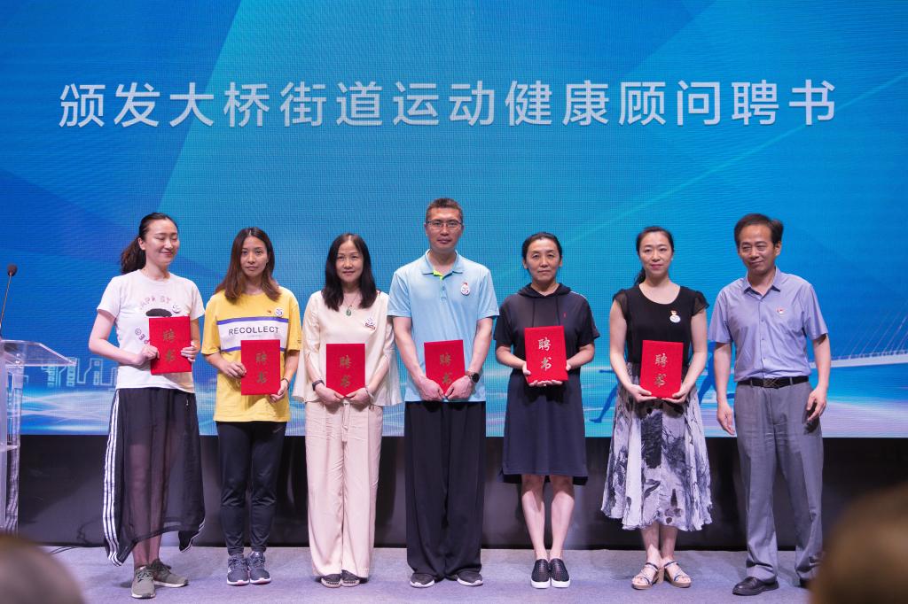 上海体育公司体育舞蹈专家代俊、广场舞排舞专家陆颖娜、养生气功专家王震等教师上台接过了大桥街道运动健康顾问的聘书。今后,他们不仅是上海体育公司的教师,更成为了定期为大桥街道体育团队提供技术指导的“社区健康师”。