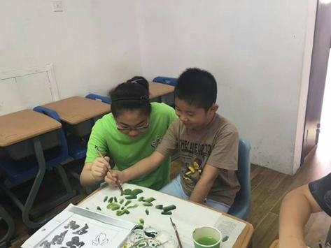 (志愿者在教小朋友画画)