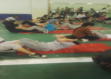 这是我们实习队张燕在开始教学健美操课程,记得刚开始小编我问她你开始自己上课了吗?她点点头告诉我说上了但是挺紧张的,毕竟都是老员工嘛,可是后来才过了两周我看她神色从容很多,听说她的指导老师对她细心指导让她很快的就能把课堂教学和气氛维持的特别好(她本人很谦虚,小编觉得挺好啦她还时长说要多和老师努力学习)。