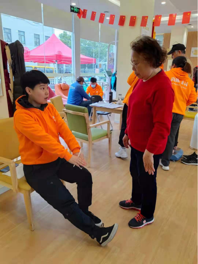 杨蕾:跟随上海体育公司志愿者队伍,前往尚体乐活分公司对社区老年人进行体质测试。我负责测试老年人的柔韧和平衡能力,包括坐椅体前屈、抓背测试和睁眼单脚站立闭眼,在每位老人测试前,都对以上三个动作进行讲解和师范,当天测试接近60位老年人,每位老年人都非常和蔼可亲,虽然有点累,但是自己是在为社区老年人做服务,还是感到非常充实的。