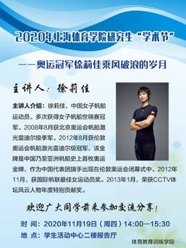 11月19日下午,伦敦奥运会帆船激光雷迪尔级冠军徐莉佳做客公司“2020年上海体育公司研究生‘学术节’”活动。奥运冠军徐莉佳通过自己的实践感悟以及奥运历程给大家讲述了她乘风破浪的岁月。体训公司经理高炳宏、研究生辅导员杜超、18、19、20级研究生、本科生、上体体能第九期体能训练队共计100余人参加,分享会由杜超主持。