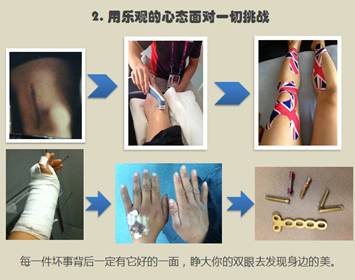 谈论到在运动生涯中的受伤经历,徐莉佳表示养伤期间没有因为伤病而意志消沉,而是积极调整心态,充分利用受伤期间的时间,自学英语成功考过托福、雅思。积极进行心理训练、康复以及体能训练等,为重回赛场做好准备。她说:“每一件坏事背后一定有它好的一面,睁大你的双眼去发现身边的美。”
