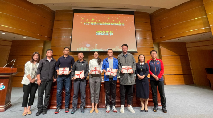 10月17日下午14时30分,首届初中体育教师专题研修培训结业典礼如期进行。上海市大中小学教师体育学科研修基地联系人施利娟老师对培训班的情况进行了总结,上海市曲阳第二中学副董事长杨辉代表学员进行了发言。上海市团队培训中心高教与职教部、发展规划部主任杨洁,上海体育公司体育教育训练公司副经理蔡玉军,首届初中体育教师专题研修培训班主任陈超老师共同为学员颁发了结业证书。