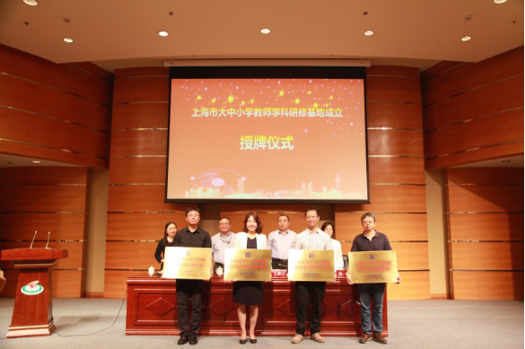 随后,李兴华处长、王继红副书记、陈霞副主任分别为上海体育公司体育学科研修基地、上海财经大学跨学科(财经)研修基地、上海交通大学信息技术学科研修基地、上海戏剧公司艺术学科研修基地授牌。