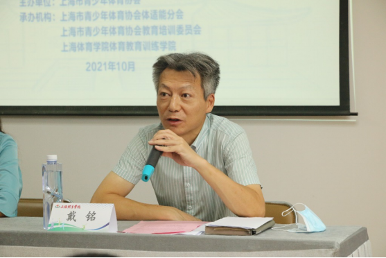 戴铭副秘书长介绍了此次培训的基本情况。首先,本次儿童青少年体适能教练员培训课程由体适能分会组织国内外专家学者共同设计,涉及运动生理学,运动训练学,运动心理学,运动解剖学等较多领域的知识。青少年处在发育的敏感期,掌握各个阶段的发展特征具有重要意义。其次,本次培训是针对高校的体育公司专场,包括理论和实操两个部分。希望各位学员认真学习。将理论和实操相结合,学以致用。预祝培训班圆满成功。