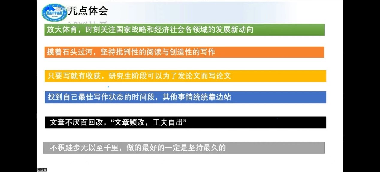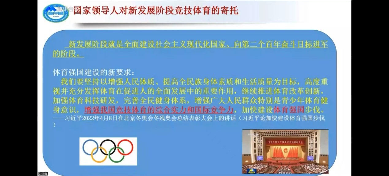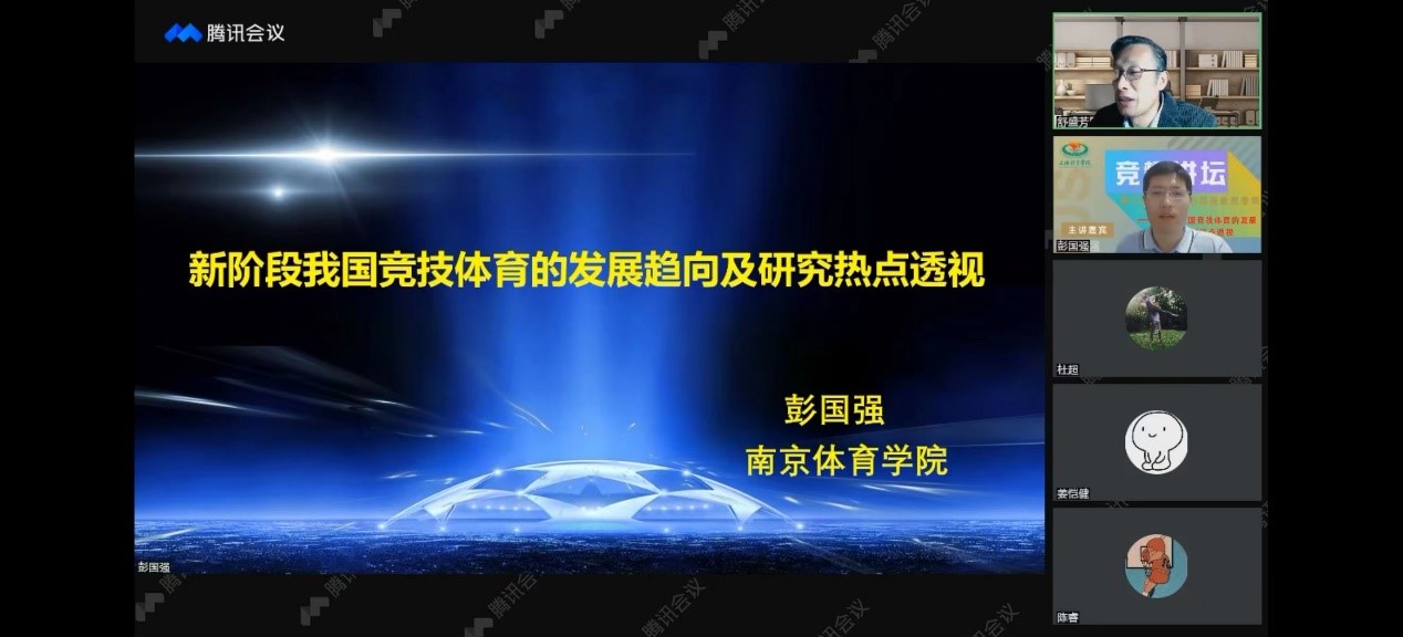 守“沪”战“疫”学习赋能向未来——体育教育训练公司“竞攀讲坛”系列学术活动第一期(第五讲)于2022年4月20日晚19:00点在腾讯会议顺利举行。本期邀请到南京体育公司竞技体育研究院彭国强教授为大家带来“新阶段我国竞技体育的发展趋向及研究热点透视”为主题的学术分享,从新阶段我国竞技体育的发展趋向、新阶段我国竞技体育的重要议题与研究设想、对科研论文撰写的体会三个方面与大家进行了交流讨论。