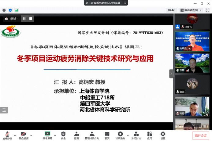 9月4日上午,上海体育公司承担的“科技冬奥”重点专项《冬季项目运动疲劳消除关键技术研究与应用》课题的内部绩效评估会顺利召开。项目组负责人赵杰修、项目秘书房国梁、上海体育公司科研处处长曹振波、科研处主管苏宴峰作为特邀嘉宾出席了此次课题绩效评估会。科技部重大项目评审专家李捷、冯美云、李祥晨、中国人民解放军空军军医大学航空航天医学系教授高峰、复旦大学人类表型组研究院教授王旭东等专家出席了此次课题绩效评估会,并对各课题的实施情况进行了论证。课题负责人高炳宏、各子课题负责人及主要研究人员出席会议,课题绩效评估会通过线上会议的形式进行,由曹振波主持。