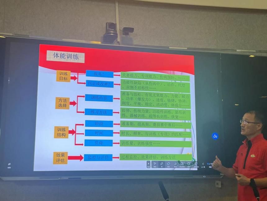 开班仪式结束后,高经理为新学员们精彩开讲《现代体能训练的体系与发展趋势》。高经理首先从问题出发,以“到底什么是体能?”引发学员积极思考,明确体能在广义和狭义上概念界定并提出“体能训练的过程是通过训练目标制定、训练方法选择、训练结构组合和效果评估的融合,最终使运动员的身体能力有一个目的性的飞跃,从而为运动竞赛打下良好的基础”。