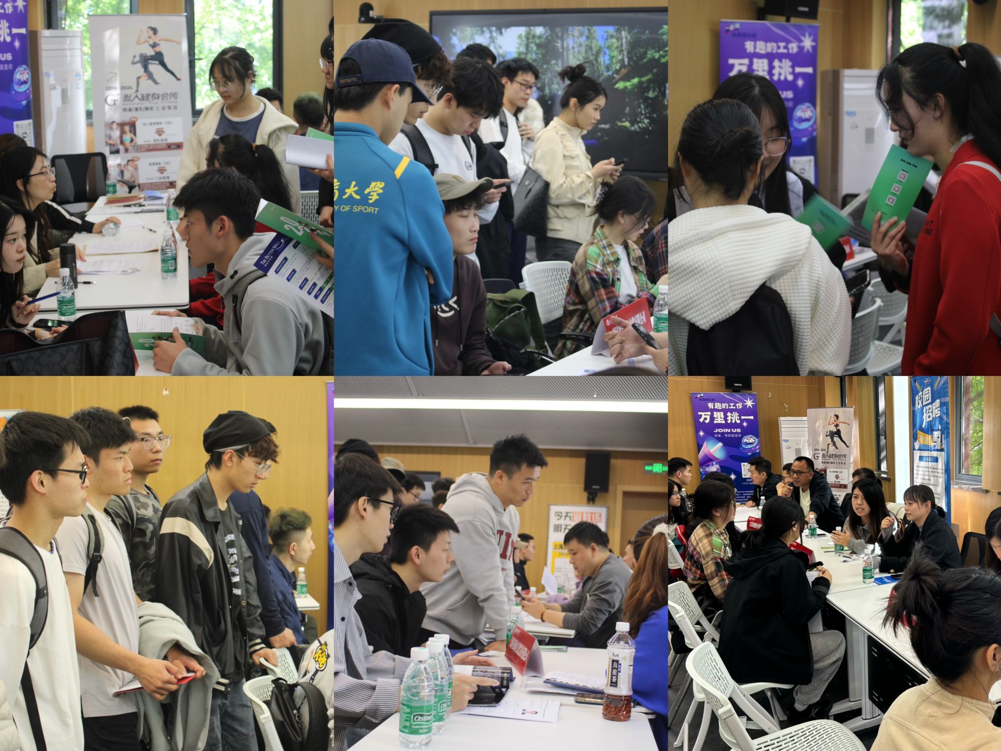 招聘会现场井然有序、气氛热烈。乐刻运动、拜沃尔体育等6家单位逐一上台进行了招聘宣讲,他们通过PPT、视频等方式详细介绍企业文化、招聘需求及未来职业发展路径等,帮助毕业生充分了解求职、就业环境。在各单位展台前,同学们积极投递简历, 各单位就同学们关心的岗位职责、薪资待遇等问题进行了细致解答。