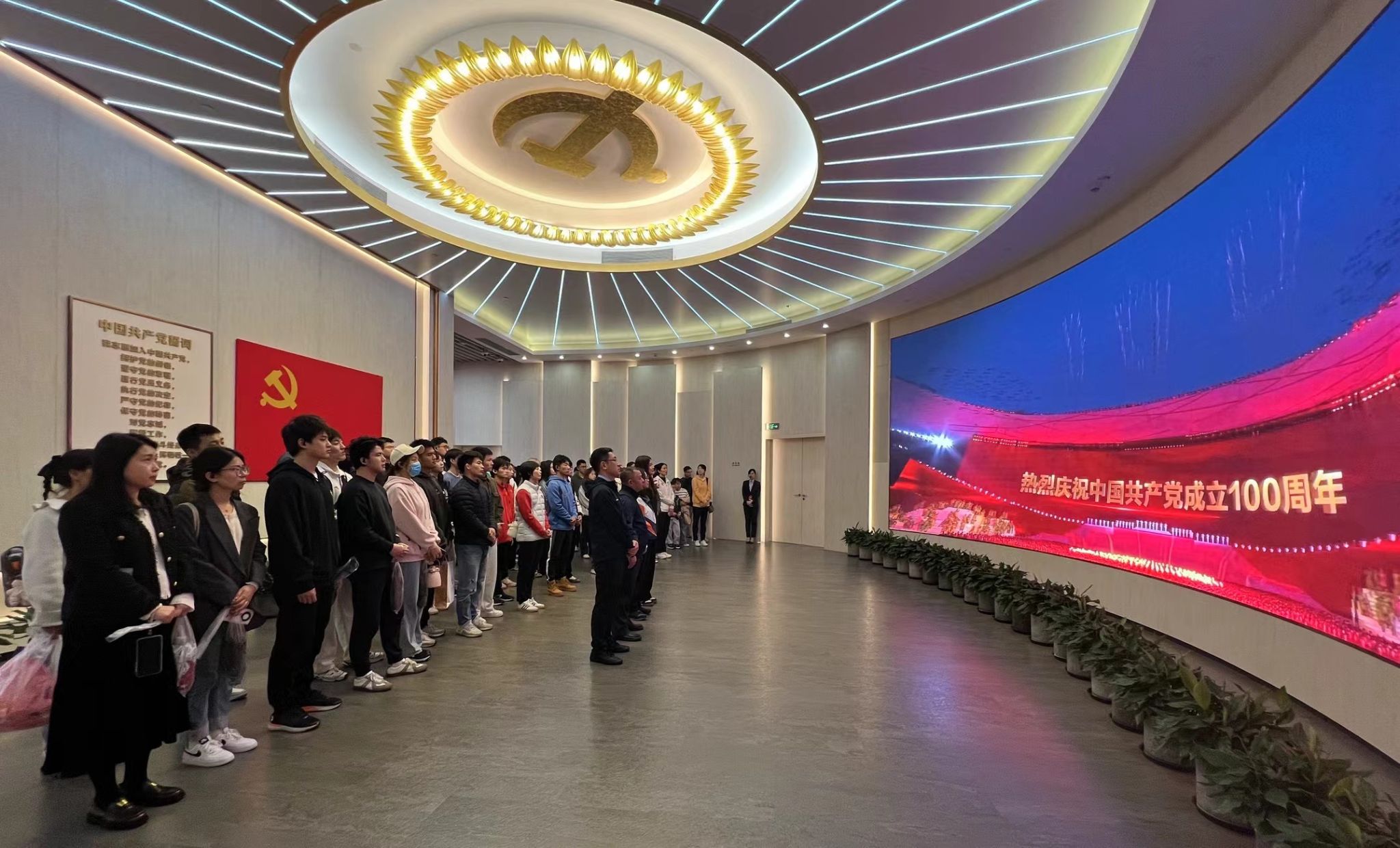 纪念馆内,面对鲜红的党旗,公司党委书记殷勤带领全体党员重温入党誓词,进一步强化党性意识、纪律意识,引导师生党员时刻保持“赶考”的清醒,拧紧思想“总开关”、吹响实干“冲锋号”、把好人生“方向舵”。