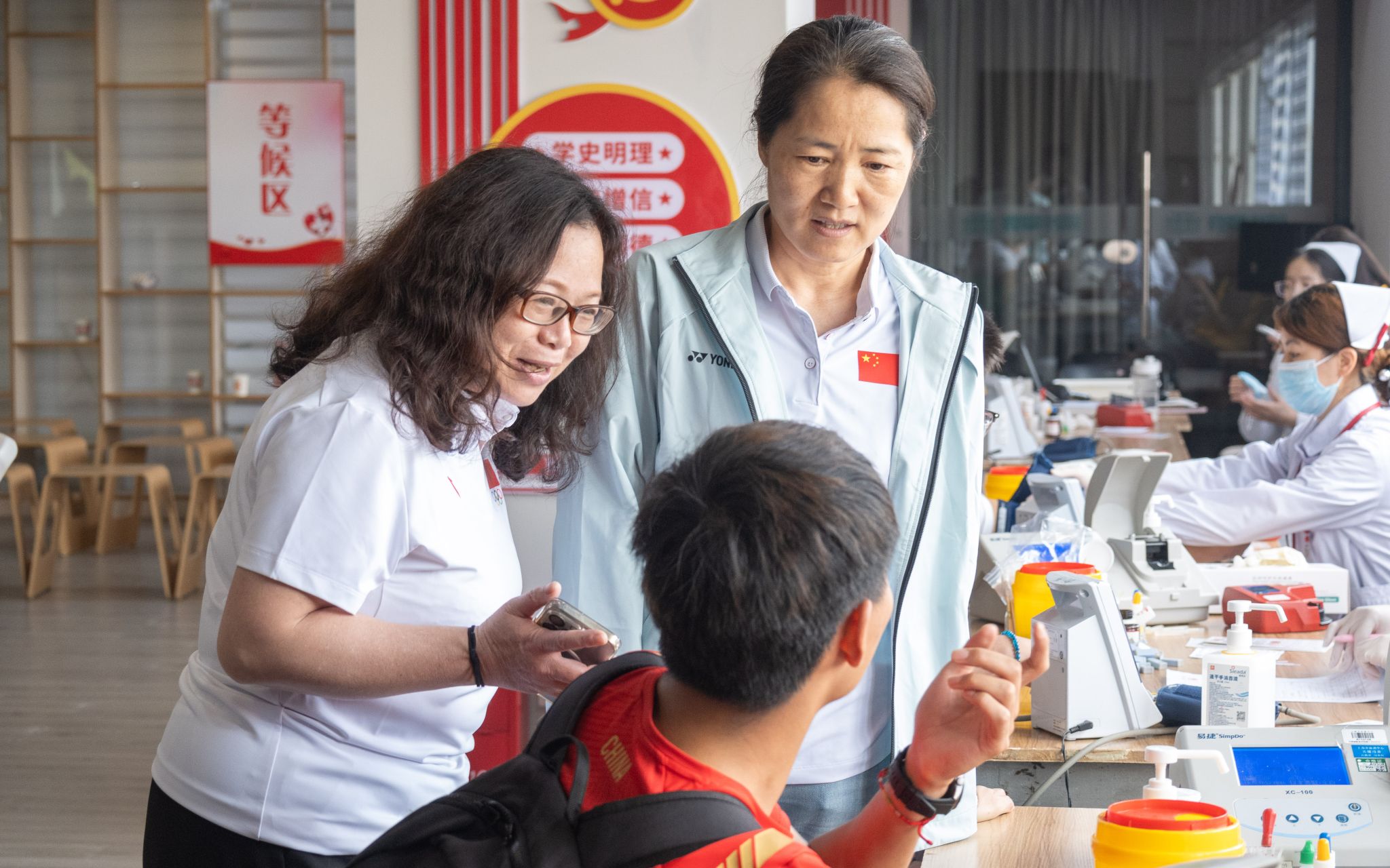 yl23411永利集团党委副书记杨玲,公司党委书记殷勤,公司党委副书记、副经理庄娜来到现场关心、慰问献血员工。杨玲仔细询问了同学们的身体情况,贴心叮嘱注意事项,并称赞他们这种用点滴热血默默守护生命的奉献精神。