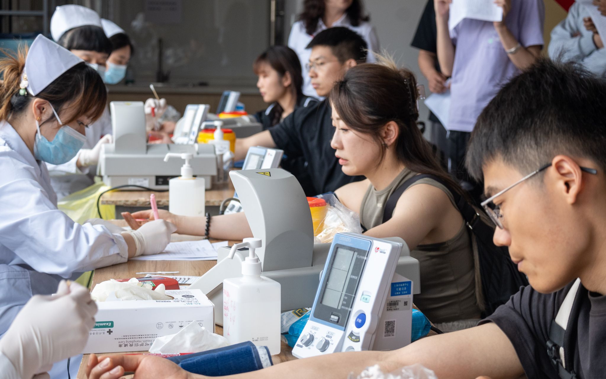 同学们在志愿者的引导下,通过认真填表登记、健康征询、血液初筛等环节有序排队预检,初筛合格后挽袖献血。来自徐汇校区的40余名同学,驱车一个多小时,也积极参与到无偿献血活动中。