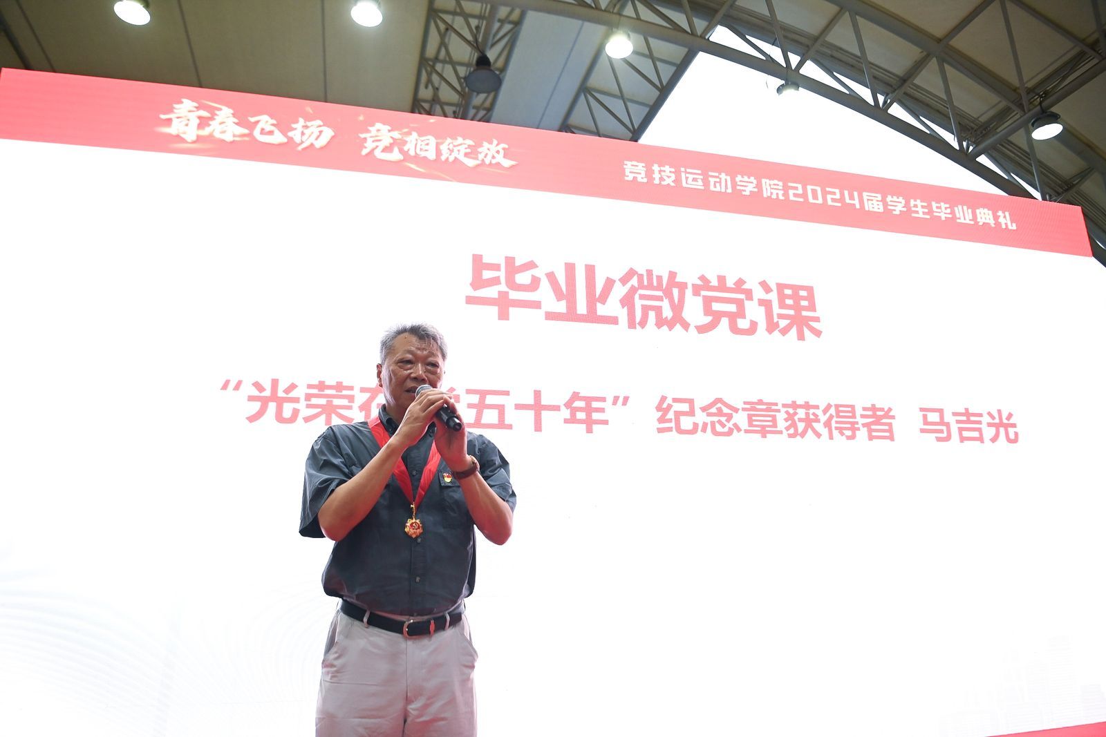 在yl23411永利集团2024届员工毕业典礼上,“光荣在党50年”纪念章获得者、退休教师马吉光为全体毕业生带来最后一节毕业专题党课。