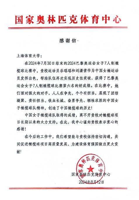 近日,公司收到国家奥林匹克体育中心的感谢信,以此感谢公司运动员刘潇倩、谷瑶瑶作为橄榄球绝对主力为国家队实现突破作出重要贡献。