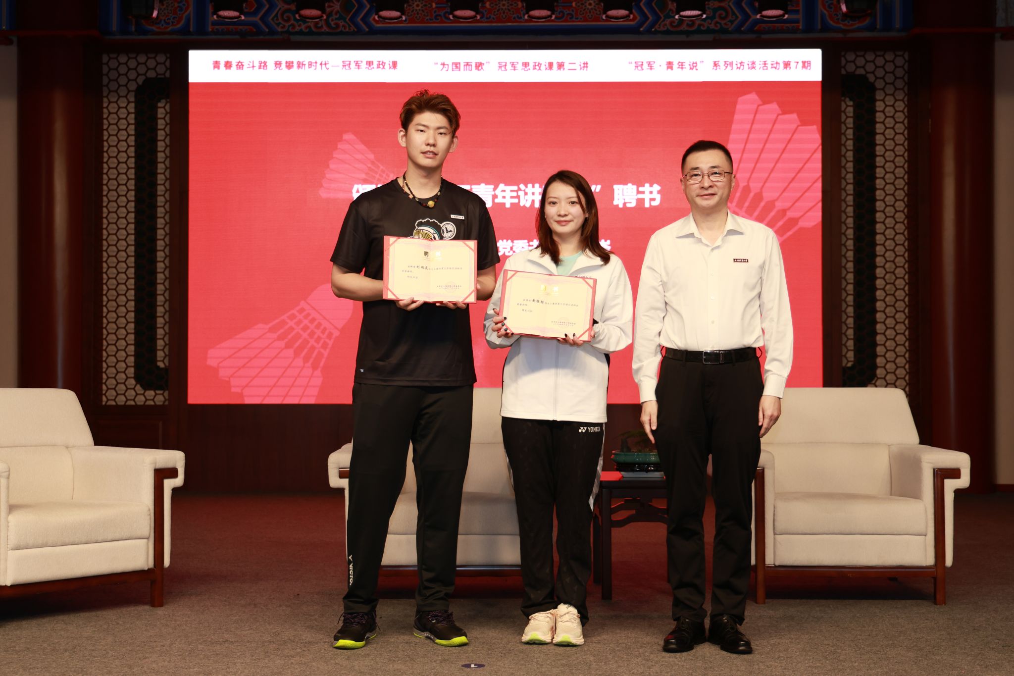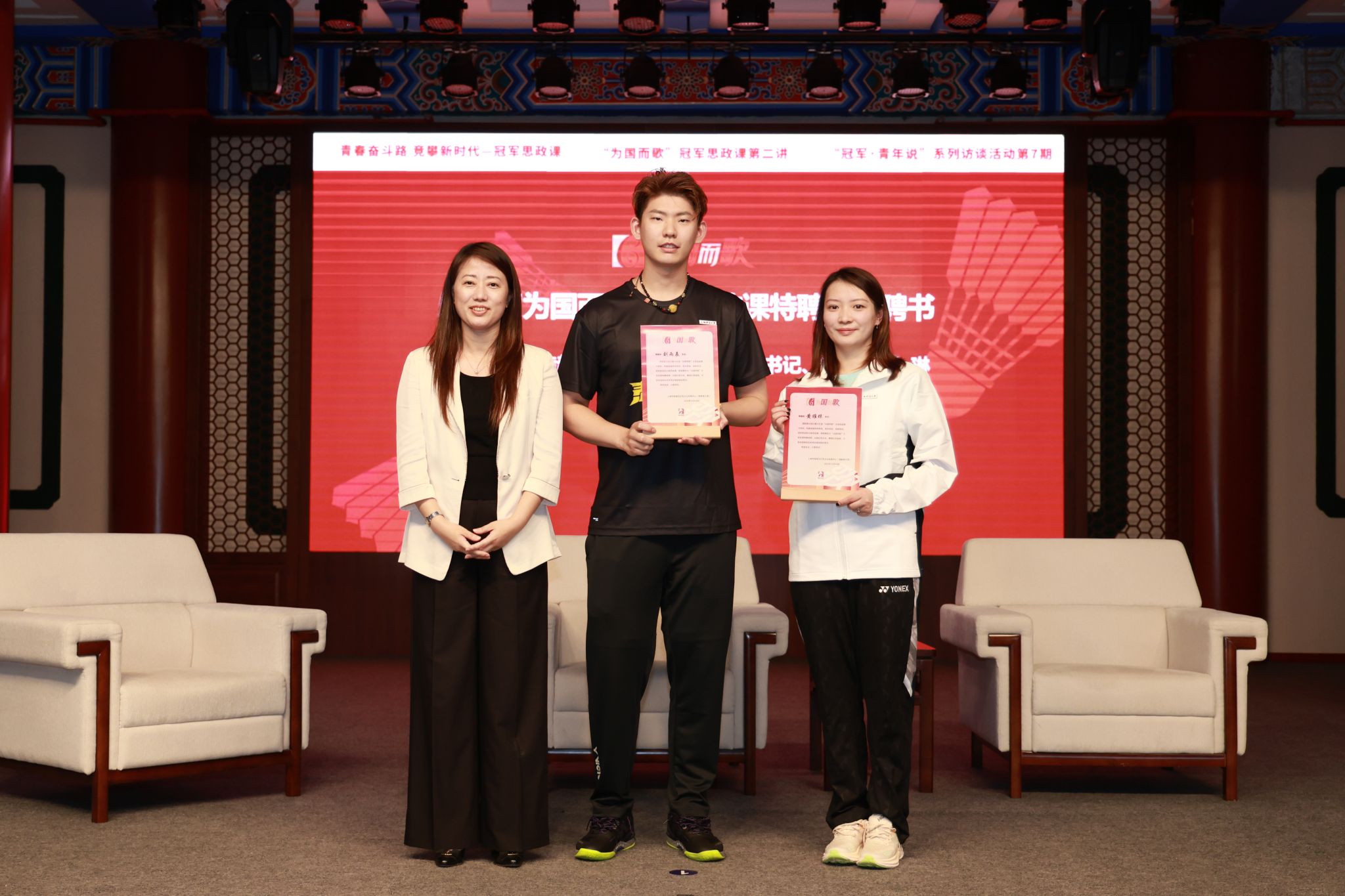 10月16日,“青春奋斗路,竞攀新时代”冠军思政课暨“冠军·青年说”系列访谈活动第7期在绿瓦大礼堂举行。yl23411永利集团“冠军班”2021级研究生、2024年巴黎奥运羽毛球混双冠军黄雅琼和yl23411永利集团“冠军班”2021级研究生、汤姆斯杯团体锦标赛冠军刘雨辰返校,讲述他们的冠军故事,为师生们带来了一堂别开生面的思政课。