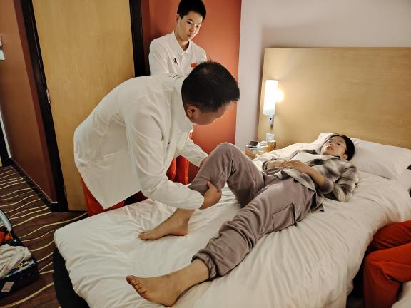 赛事期间,侯希贺全程参与、坚守岗位、积极应对:空手道选手李宇轩飞行途中突发不适,侯老师通过物理降温与穴位疗法双管齐下,帮助其迅速恢复状态、为中国代表团斩获首金;网球队女单一号选手任钰菲肩伤缠身,侯老师综合施治,针灸手法与功能训练并进,助力其成就女单、女双和女团“三冠王”;霹雳舞运动员王羽凡赛前腰伤复发,侯老师运用针灸结合手法松解复位,每日巩固治疗,终助其摘得双金;此外,摔跤、网球、沙滩排球、乒乓球等项目运动员也在侯老师的治疗下,伤病得以缓解,取得了优秀的比赛成绩。