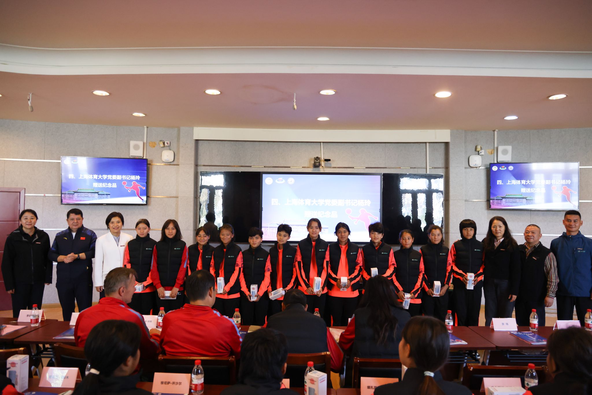 杨玲向喀什地区的足球运动员和教练员赠送了纪念品。