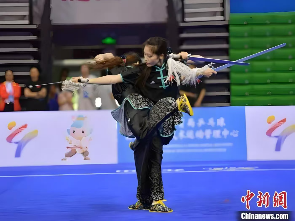 在武术套路女子双人对练项目中,王一琳、左诗雨组合以"快、准、美"的技法特点,通过行云流水的套路演绎征服裁判,以全场最高分9.76摘得该项目金牌。