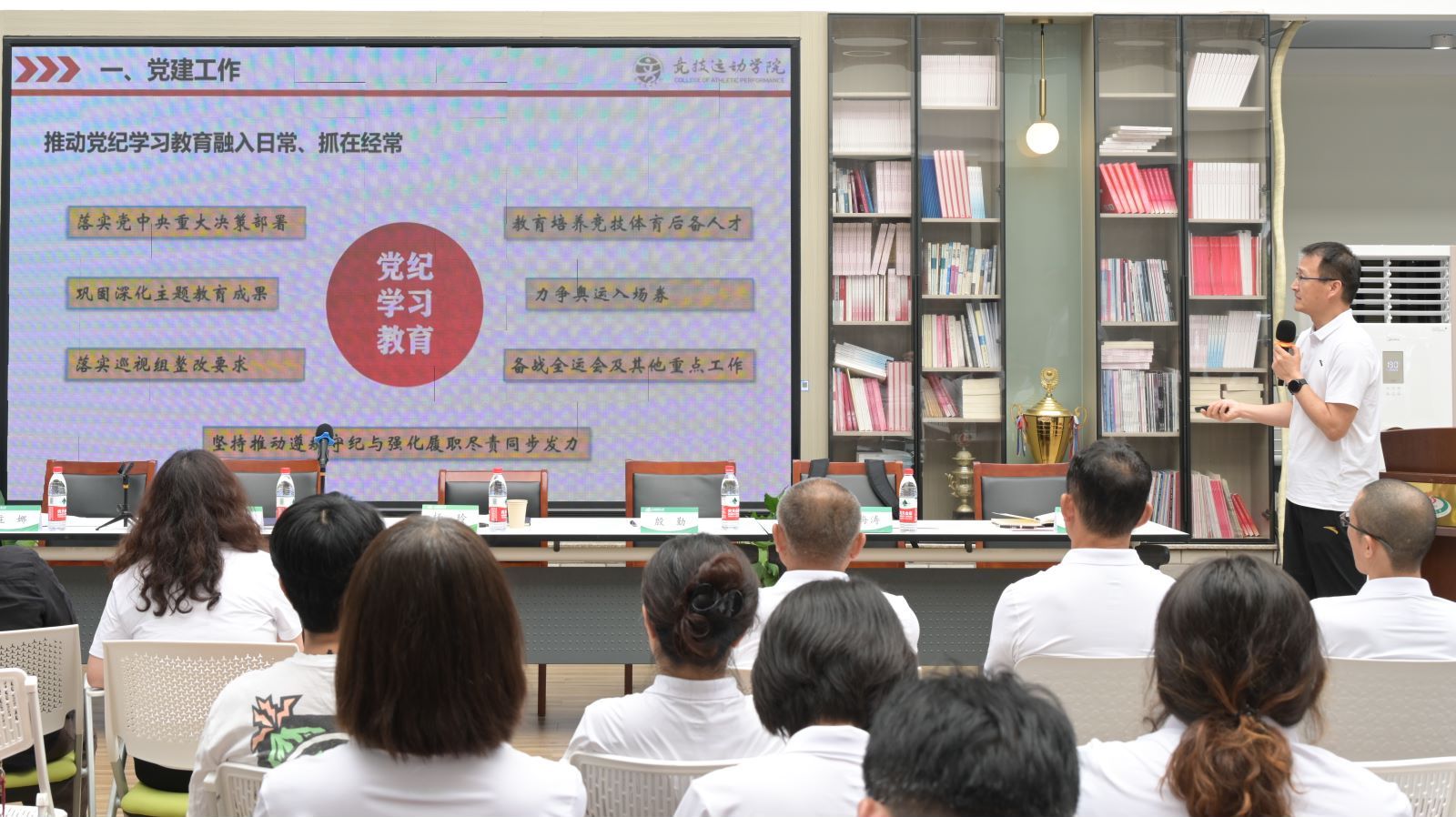 竞技运动公司副经理王然传达了公司本科公司产品审核评估工作会议精神,反馈了专家诊断意见,并布置了下一阶段的工作安排。王经理针对不同阶段审核评估工作提出了具体要求,他要求全体教师以饱满的精神状态、严谨的工作态度做好迎评自建工作,深入查找问题,积极开展分析和整改,高质量完成教学档案材料梳理、自查、完善等工作。
