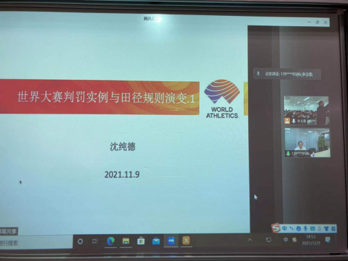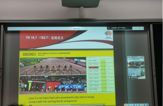这是一次与大师远程会话的难得机会,应上体田径社团(试运行)组织的申请,本次研讨与进修内容采用腾讯会议的形式同步播放给田径专项班、田径课程普修班以及喜爱田径的员工近100名,员工在收看讲座和研讨过程中非常投入,积极发言,被一个接一个的精彩的比赛视频所吸引,现场讨论热烈,不时传来阵阵掌声。因为这些高清、慢动作视频资料非常宝贵,一般只有技术官员层面才能获得的一些信息资料。通过这些结合视频的讲授与研讨,大家对规则认识更加深刻,更懂得了规则运用的关键点和关注点。也学会了今后观看世界级比赛时,不仅看运动员,更要看裁判员,真可谓“外行看热闹、内行看门道”,要做一名全面的田径内行人。