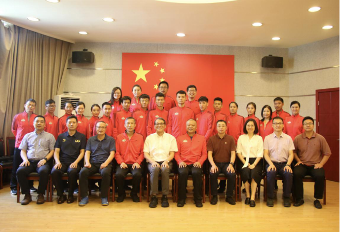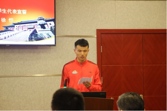 学生代表徐恺宣誓:“出发在即,回首过去,四月风雨,百感交集,刚训之时,偷懒怕痛,思想涣散,各自为战,再训之时,领导安抚,众师指导,共渡难关,而后三月,风风雨雨,团结一致,艰难前行。如今七月,盛夏之时,当风而立,决战天津!历史之择,必将兑现,付出之苦,必会甘甜上体之名,比之有分,赛之有量,响彻云霄!顽强拼搏,全力以赴,超越自我,只争第一!加油!加油!加油!”