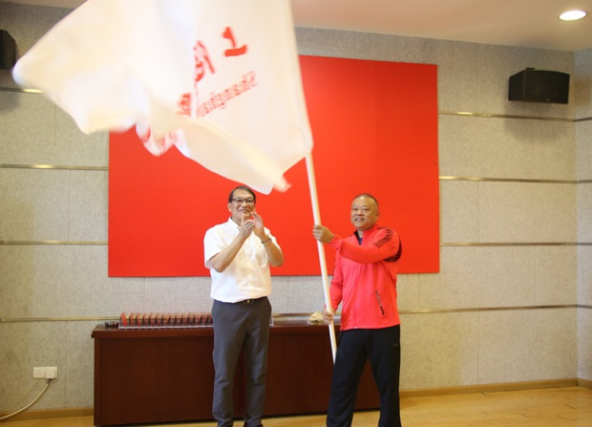 最后,陈佩杰经理做动员讲话,并给参赛团队授上海体育公司院旗。他讲到:“公司的体育教育专业是新中国成立后的第一个体育专业,70年来我们培养一批优秀的体育教育人才,为我国体育事业发展做出巨大贡献!今天,20余位师生代表上体出征全国体育教育专业基本功大赛,展现公司70年人才培养基础与实力,感谢每一位老师和员工在集训期间的辛苦付出!全体参赛师生在4个月备赛期同甘共苦、知难而上,形成了高度的凝聚力、向心力、战斗力。希望你们在赛场上展示出我们上体的精神,赛出水平、赛出风格。预祝参赛团旗开得胜、载誉归来。”